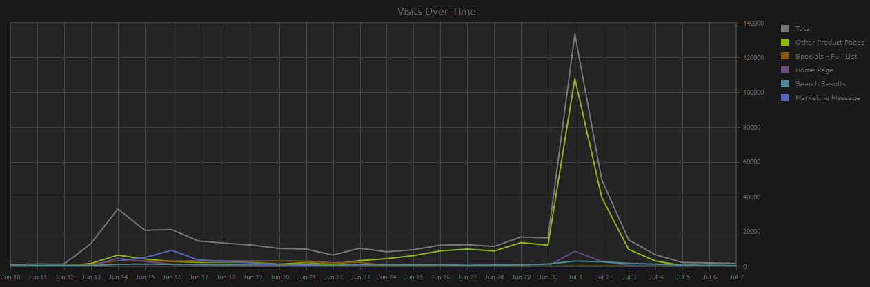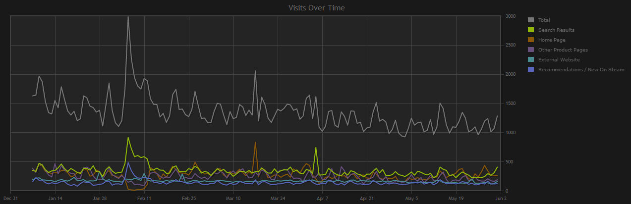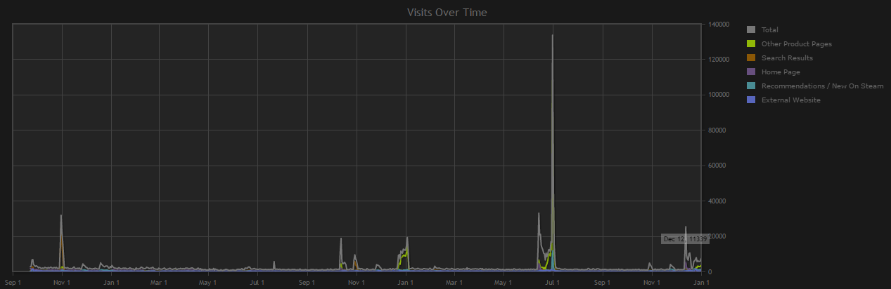Steam added traffic reports back in 2014 along with Discovery update 1.0. Traffic data only goes back as far as the Discovery update 1.0 launch, but here's a chart of all of our lifetime traffic since then: