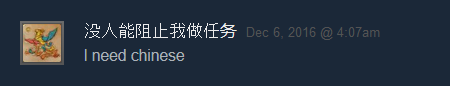 Therefore, I'm already working on a small experiment for 2017 -- a partial translation of the game into Simplified and Traditional Chinese. This will cover all of the game's User Interface and gameplay text. This means the game will be entirely playable in Chinese, but the story content (about 75% of the total word count, but not necessary to play the game) will remain in English. If I see sufficient evidence that this causes the game to gain traction with Chinese players, I'll follow through with a complete translation of the story content as well.