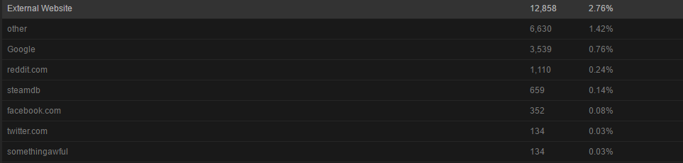 So that experience clued me into a really interesting observation -- even in the presence of a heavy hitter like TotalBiscuit sending you a traffic spike, the vast majority of the resulting Steam Traffic is generated internally.
