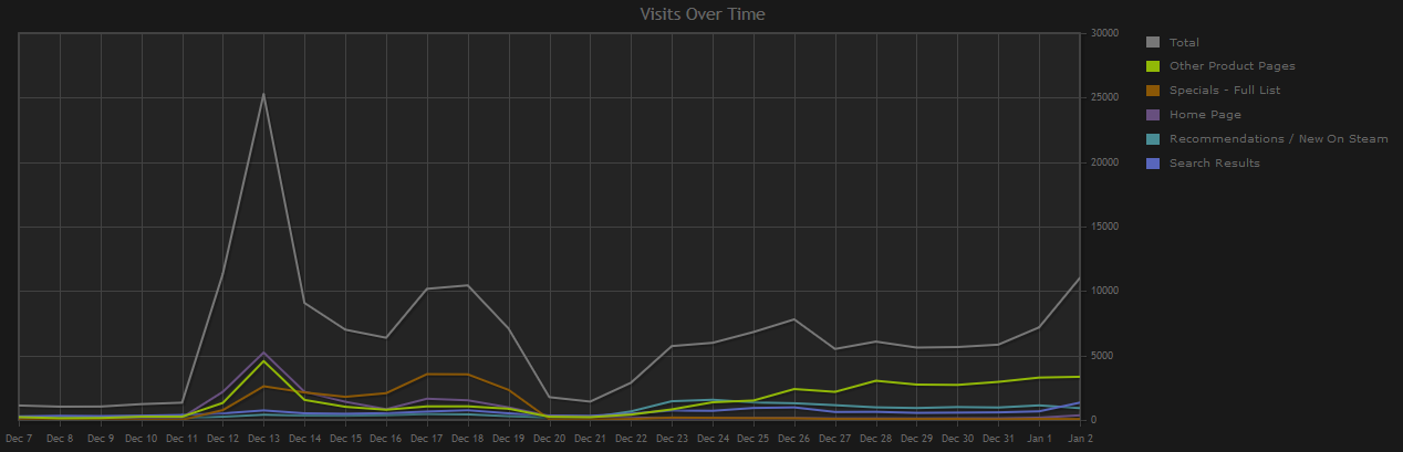 Discovery Queue is back on top, but it's not nearly as out of control as it was during the Total Biscuit spike. In fact, during this end-of-year promotion period (which covers a self-serve sale, a spent visibility token, and the Holiday sale) we see a wide spread of organic discovery channels.