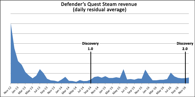 The upshot of all of this is that we were about to fall off a cliff in 2014 (the game was three years old after all), but the Discovery update held us steady and slowed the descent, and in this past year we actually reversed the downwards trend of year-over-year revenue: