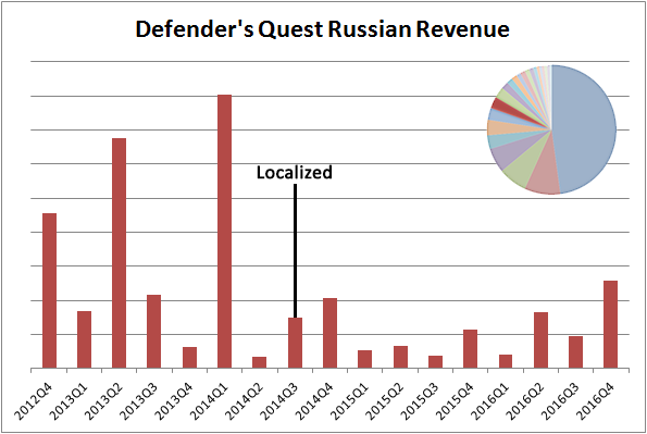 Japanese and Korean are where we start to see surprises. Whereas plenty of Germans, French, and Russians were happy to buy the game in its first two years, it wasn't until after Defender's Quest was localized into Japanese and Korean that we started to see significant attention from Korea and Japan. Although it's logical that Asian countries would be more sensitive to localization given the smaller number of English speakers and the much stronger preference for their own native languages than we see in Europe, this conclusion is slightly confounded by the fact that Steam itself has been steadily expanding into Asia around this time with features like local currency support and better client localization.