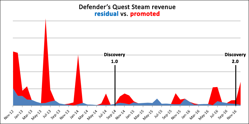 This chart shows our monthly gross revenue from Steam since we launched there in late 2012 (Defender's Quest originally launched off-steam in January 2012, selling direct and via web game portals like Kongregate). I've broken the revenue into two categories stacked on top of each other -- promoted, and residual. Promoted means anything tied to a sale, major event, or anomalous source of external traffic, and residual is everything else -- the basic revenue your game gets by random users finding your game on Steam without any special force pointing them towards it.