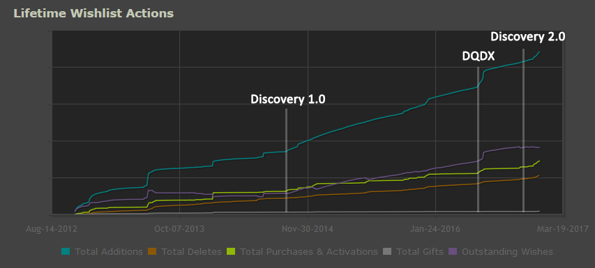 Lastly, when the DQDX update is released we see a sharp uptick in conversions, as expected -- people were waiting for the update to buy the game, of course. And although it still might be too early to tell, there seems to be an uptick in both wishlists and conversions with Discovery 2.0, perhaps due to the new changes to visibility rounds, wishlist notifications, and wishlist-powered recommendations in the latest Steam sales. Time will tell.
