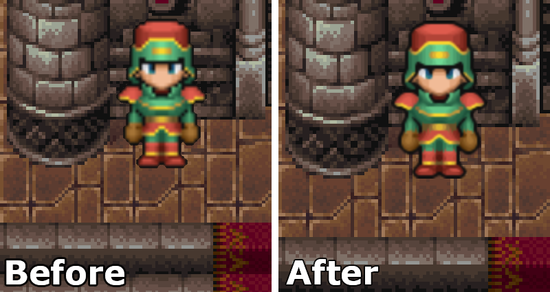 But there's at least one new tip I've come up with since, which was the direct result of feedback in the comments from last article: properly avoiding nearest-neighbor scaling artifacts in 1080p mode when using the original (pixelated) sprite art.