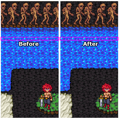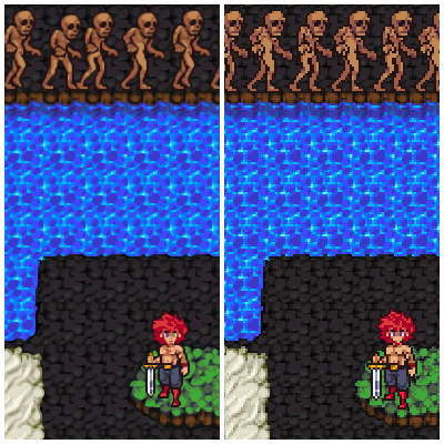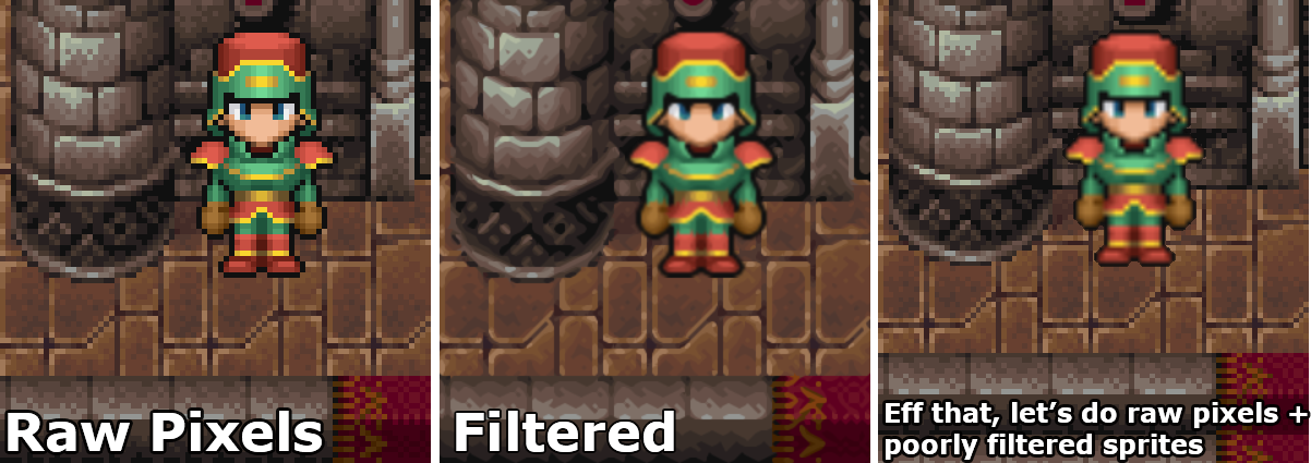 There were other complaints, like our algorithmically upscaled tile art, which is fair. We've got an artist working on a cleanup pass of the overworld which should be much more detailed, and if we have the budget we'll look into doing the battle tiles, too. As an indie there's only so many resources you can put into fresh high-res art, hence my emphasis on "doing the best with the art you've got" programming techniques.