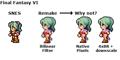 From a technical perspective, I think it would have been smarter for the developers to have gone with a resolution 4x higher than the original rather than just 2x. That way you can downscale from there rather than butchering everything with selective upscaling and ugly filters.