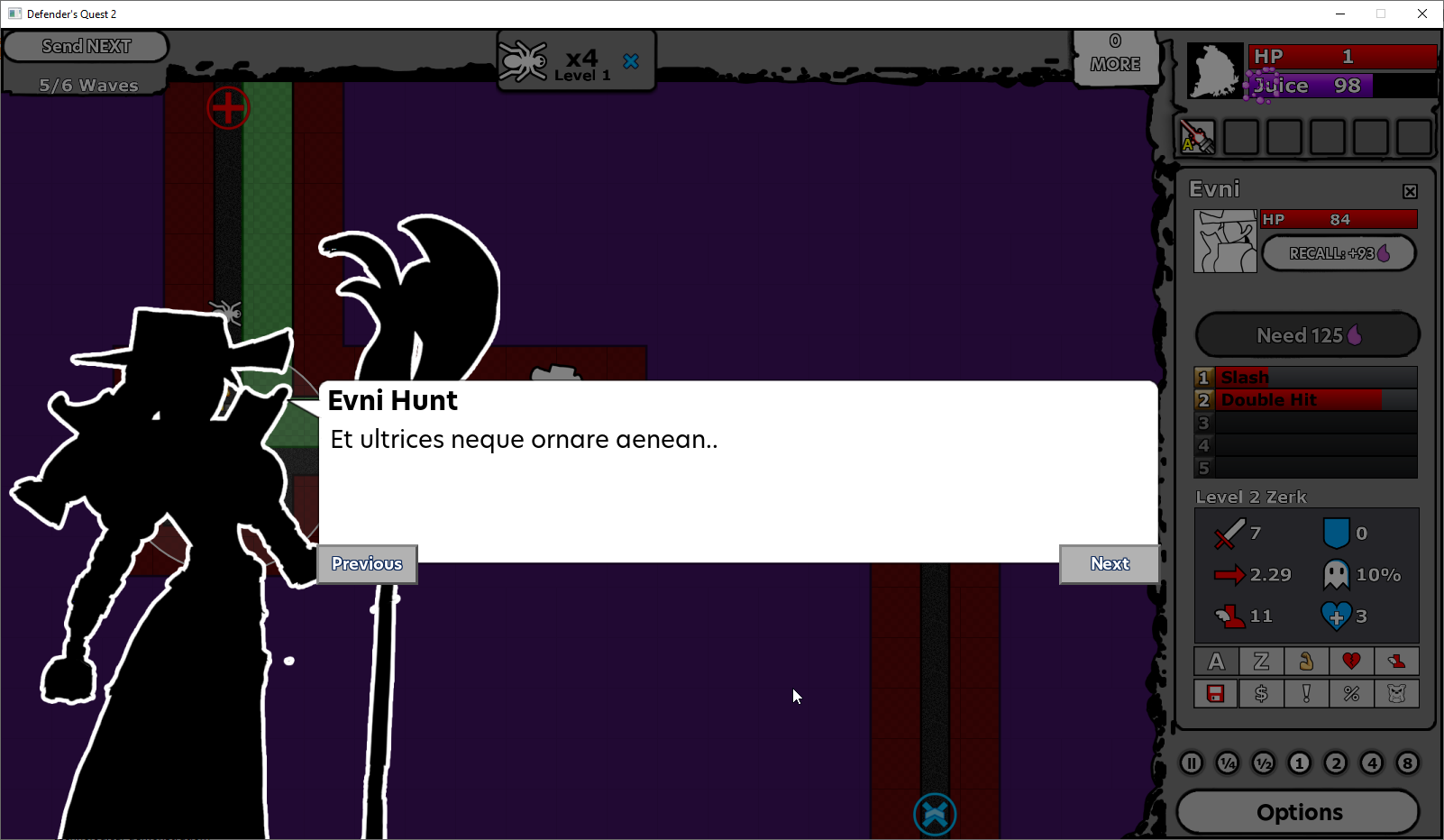 The other major change in this build is that we've put in full-sized portraits. They're just silhouettes for our tester & early backer facing builds for now, but we have actual assets on the internal side that drop in to replace them. I'm still working with layout and placement, so some text boxes might be in weird places, but I'm trying to get things sorted so that all the cool art the game will have isn't confined to tiny little floating head boxes. But unlike DQ1, we're trying to get better bang-for-our buck by putting more effort into varied and expressive facial variants rather than trying to create elaborate scripted puppet shows with multiple characters on screen and having to get their feet placement exactly right (that sucked up so much unnecessary time in DQ1 without being particularly visually impressive).
