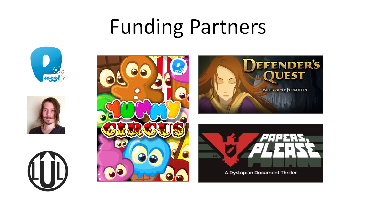 Our funding team is three developers -- Level Up Labs, 3909 (Lucas Pope's company, who did Papers, Please), and Puzzl, who did Yummy Circus.