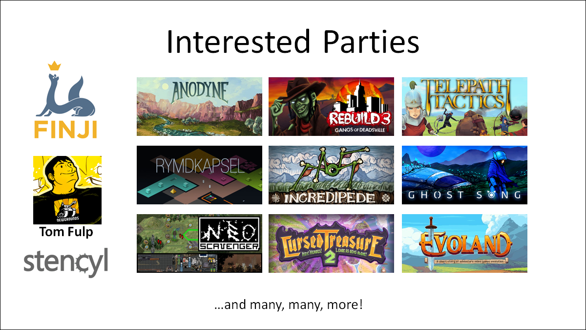 So here's just a short list of various people who are watching this project -- the developers of games like Anodyne, Rebuild, Rymdkapsel, Ghost Song, NEO Scavenger, Telepath Tactics, Evoland (Haxe's own Nicolas Canasse of course!), as well as the various engines built on OpenFL. There's my own team HaxeFlixel, but also HaxePunk, and tool companies like Stencyl.