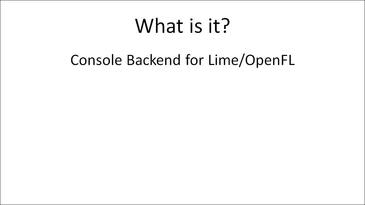 You can use the exact same OpenFL and Lime APIs you've been using so far, although it will have a new "console" renderer that is different from the existing GL, DOM, and CANVAS renderers Lime has right now.