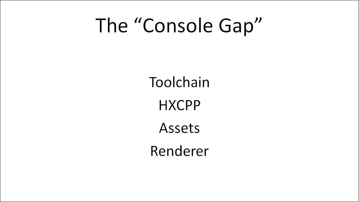 First, on consoles Haxe has holes in HXCPP, the runtime support for the Haxe standard library on C++ targets. And the holes are in different places on each platform. We could patch it in a custom way for each platform, but that's messy and inconsistent.
