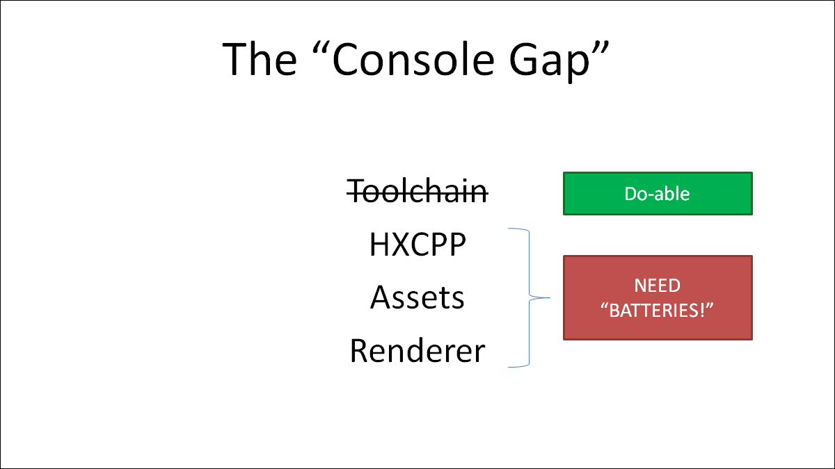There are four major parts to the console gap. First, there's figuring out the toolchain, which is basically a big ugly XML file that Lime defines for each platform target, that gets Haxe/Lime to compile and run on that platform at all.