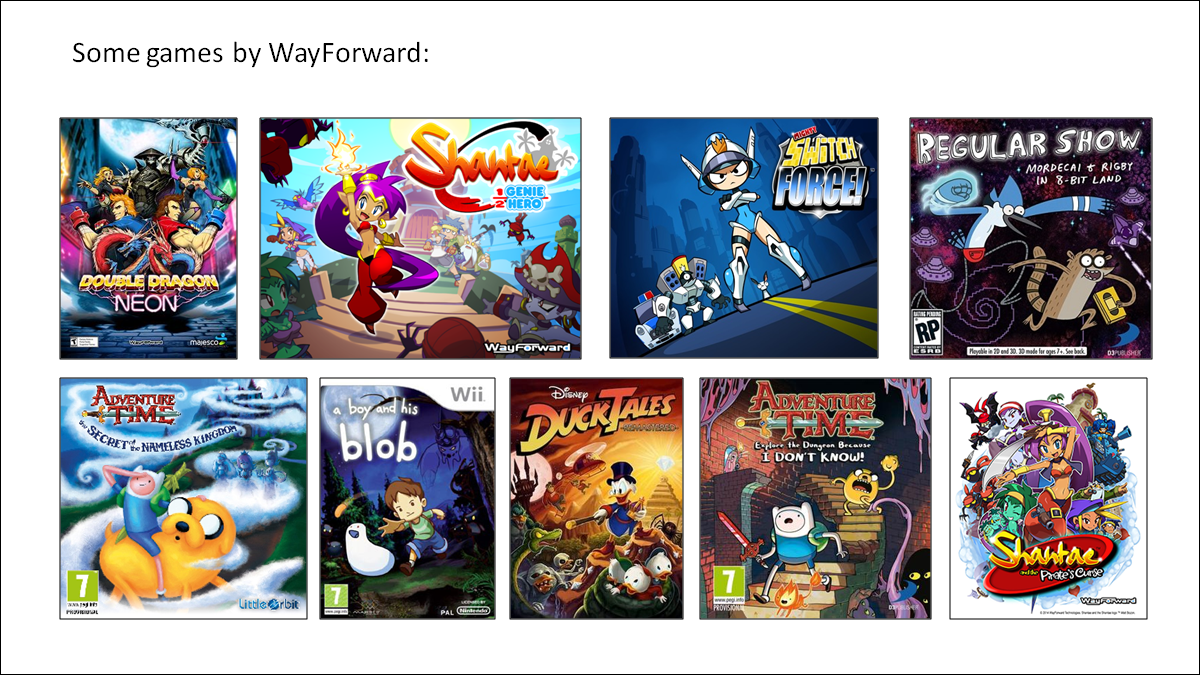 You'll recognize some of these games. They're most famous for their original Shantae series of games, but they've also done a lot of popular licensed games, such as Double Dragon Neon, Adventure Time, DuckTales Remastered, Regular Show, etc.