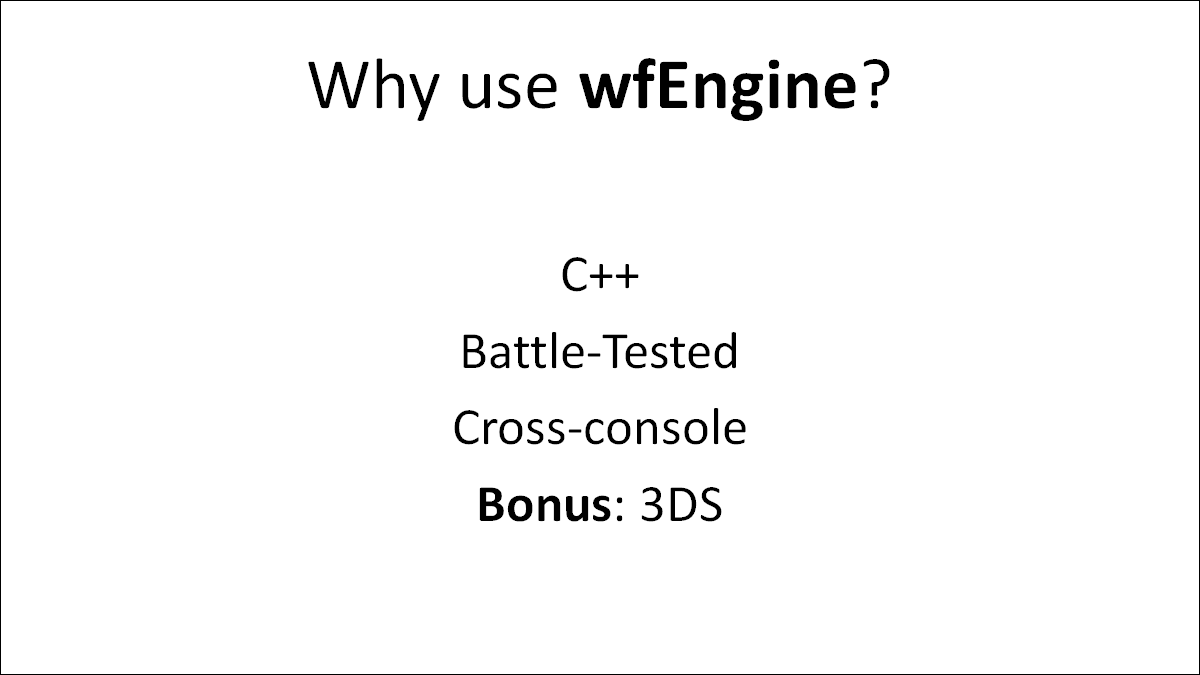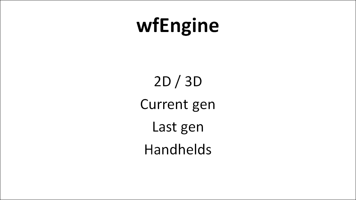 So we're licensing their in-house game tech, "wfEngine." We can't go into too much detail about it today, but the broad strokes are that it supports both 2D and 3D, and it works on both current and last gen consoles. Most importantly, it also supports handhelds!