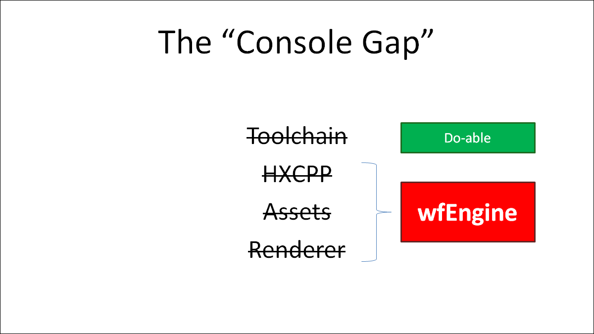 And so going back to our console gap, this plugs our remaining holes. We can use files in the lime-console library to patch HXCPP with wfEngine's implementations of anything that's missing. We can also use its pipeline and processing code to build out the console version of Lime's asset packaging. And of course, the new OpenFL "console" renderer connects to wfEngine via Lime.