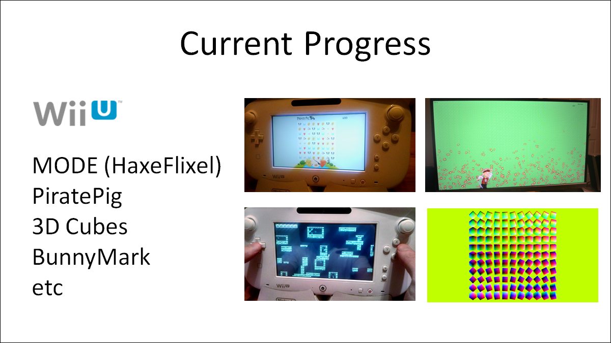 So as of today we have some demos compiling and running using this tech stack on WiiU. We've got HaxeFlixel's MODE, OpenFL's PiratePig, a 3D rotating cubes demo, a gamepad input demo, bunnymark, and audio all confirmed as working.