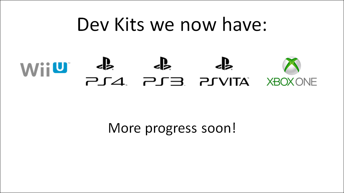 We also have access to these devkits -- WiiU, PS4, PS3, PSVita, Xbox One. The only thing we don't have yet is the 3DS but we're working on that.