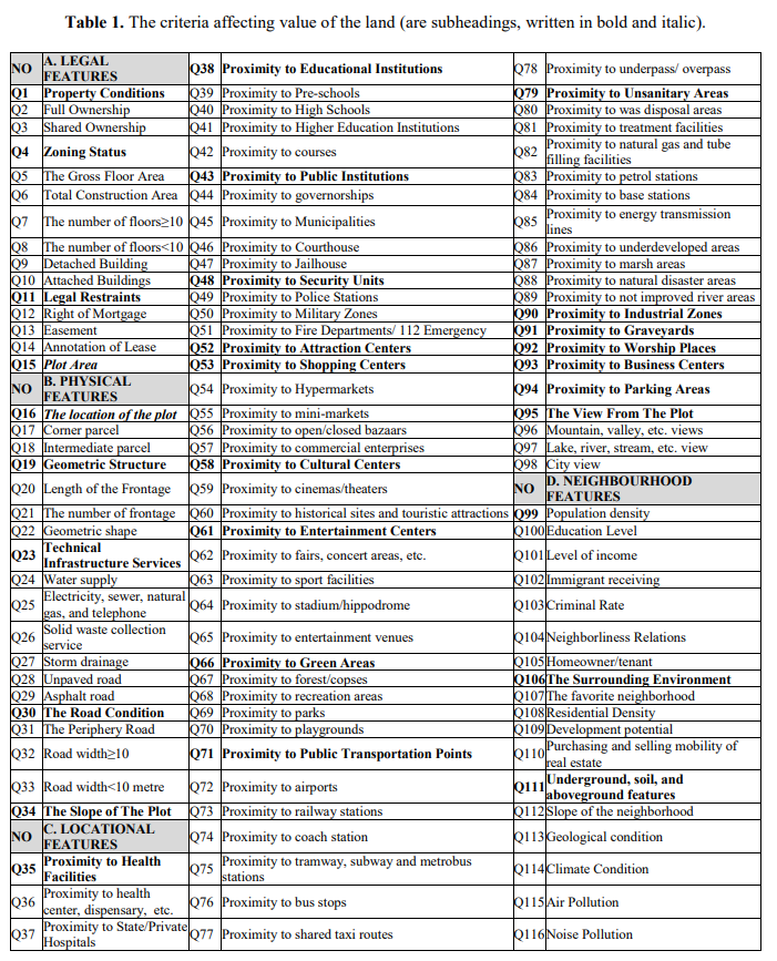 Then you create an entry for each property, fill in the values for each of those characteristics, and run it through the regressor. Take note of how many of these factors start with the words "proximity to." Each of these can be calculated automatically just by knowing where the property is on a map, and each of them is an independent contributor to the value of the property's location.