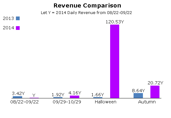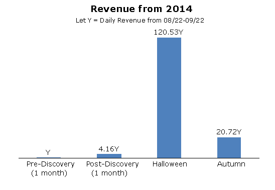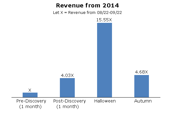 Last time, we analyzed the different traffic patterns experienced during the recent Halloween Sale and a baseline period (September 29 - October 29). This time, let's look at revenue. Once again, we're using relative figures, where X stands in for the revenue earned in a new baseline period (August 22 - September 22), the month immediately prior to the Discovery update, and Y is the average daily revenue from that same period.