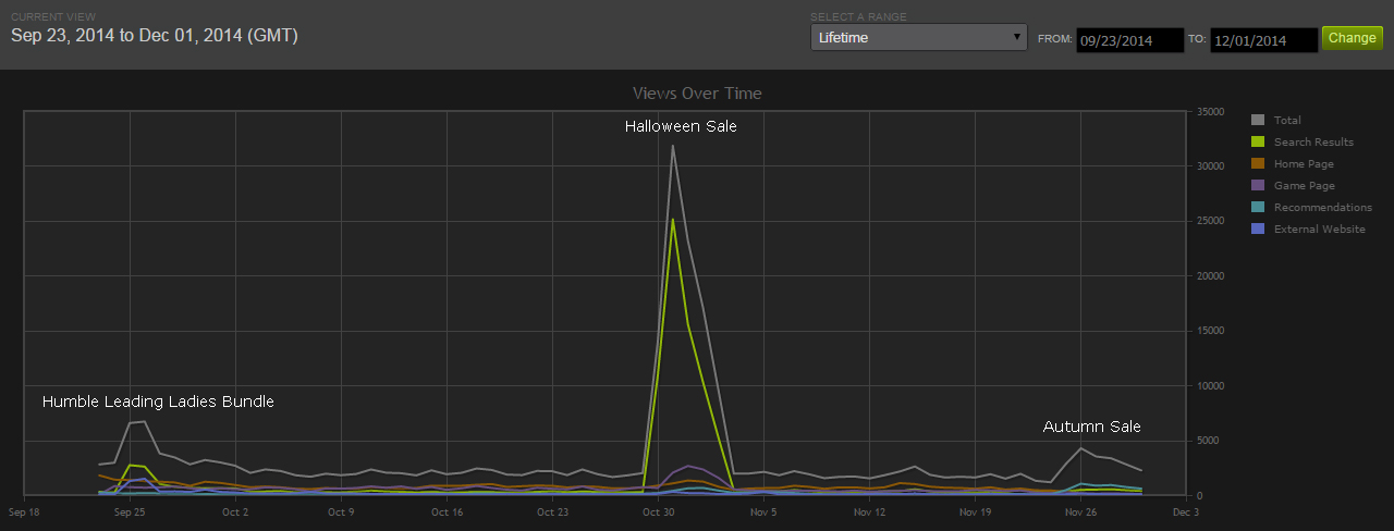 I've already reported extensively on every bit of it except the Autumn Sale, and life-to-date traffic stats would be overwhelmed by the Halloween spike anyways, so the only thing left that's worth looking into is the Autumn Sale period.
