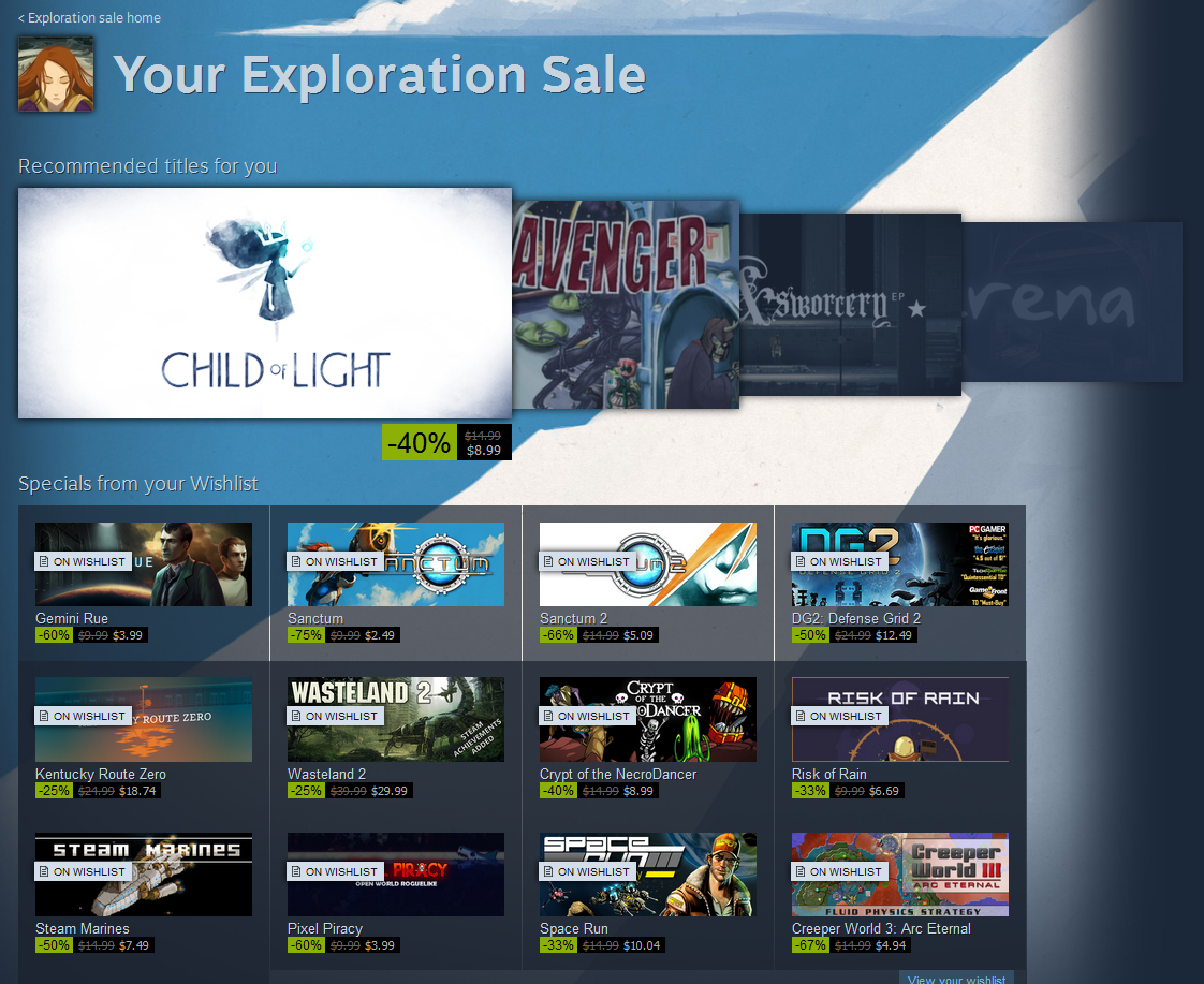 It's nice to see Steam roll out a sale that integrates targeted discovery features like this. I mean, the AlgorithmTM is supposedly looking for data to help predict what players want to buy, and a wishlist seem like a straight-up confession: "I want these games." Of course, perhaps not every single wishlist is a potential sale waiting to be reaped -- after all, the Netflix instant queue is very similar, and I have shows on there I haven't gotten around to watching in years.