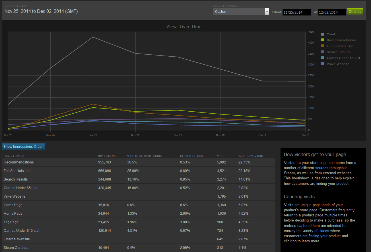 "Valve Website" doesn't tell me much because the only subcategory is "steamcommunity.com", and the rest of the categories are also-rans that aren't too important. I've extended the list all the way out to 11 just to emphasize how very little traffic we get from Steam Curators -- the feature that got the most press attention when the Discovery update launched. Curators are a complete after-thought for us, we're much more interested in the organic traffic sources. Then again, if TotalBiscuit, Jim Sterling, or Rock Paper Shotgun want to put us on their lists, I'm not going to complain...