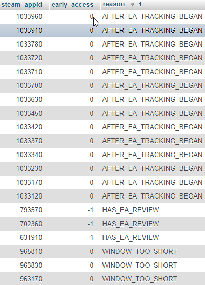 Further, when I drill down to a specific game for analysis purposes I typically double check the Early Access status manually (and update it in the DB if necessary). There is the chance I could be misinforming someone on a particular game, but the best I can do there is publish this article and ask for people's corrections and suggestions and slowly improve over time.