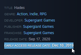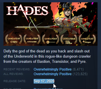Hades' release date reflects not the first day it was available on Steam, but the date on which its Early Access period ended: